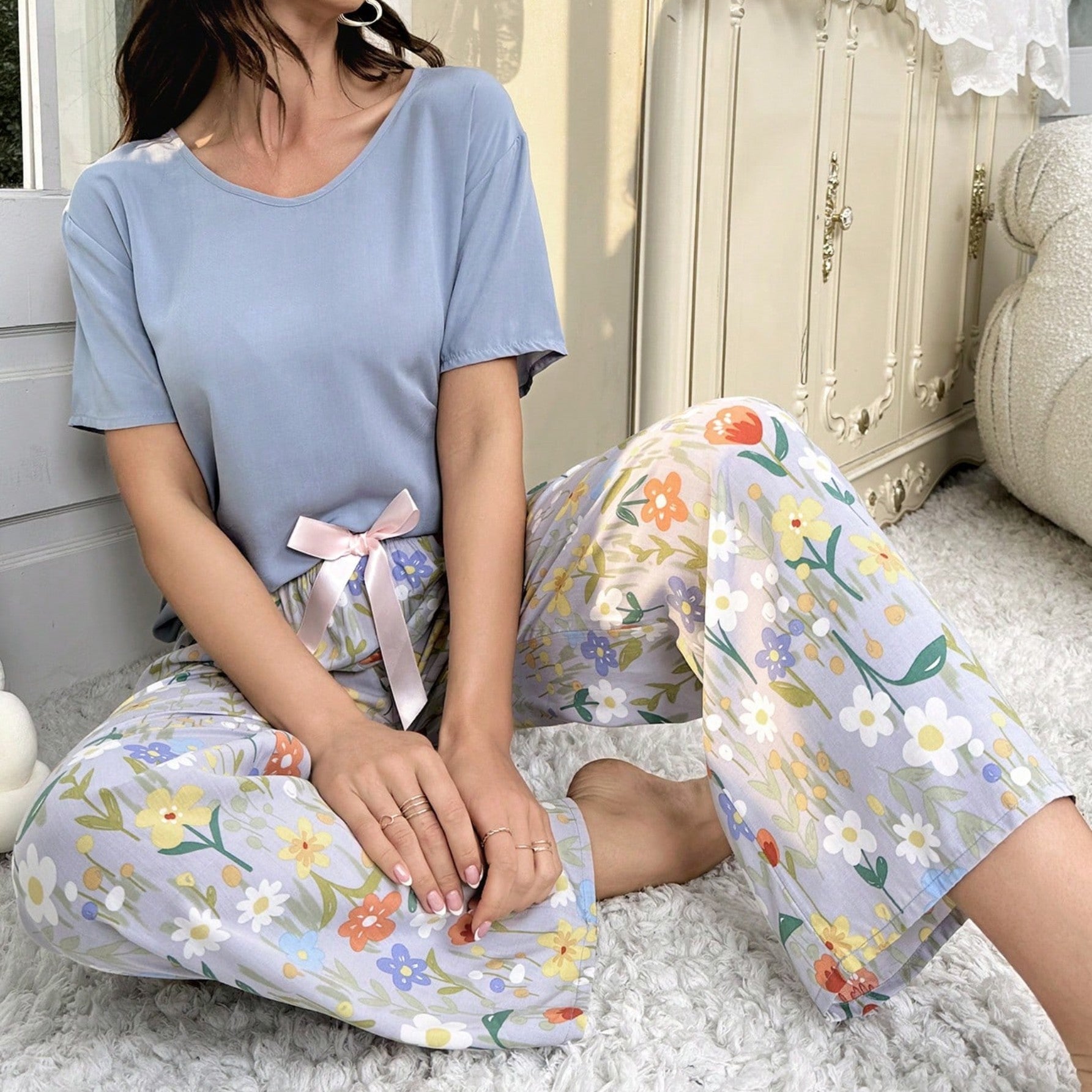 Cotton Silk Casual Pajamas Set Home Wear - Blue Top + Sunflower Print Trousers