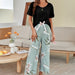 Cotton Silk Casual Pajamas Set Home Wear - Gray Top + Green Lily Printed Trousers