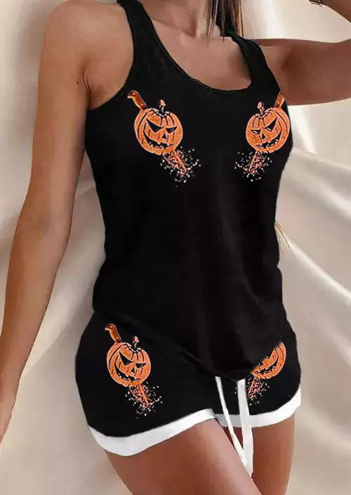 Halloween Pumpkin Face Racerback Tank And Shorts Pajamas Set - Black