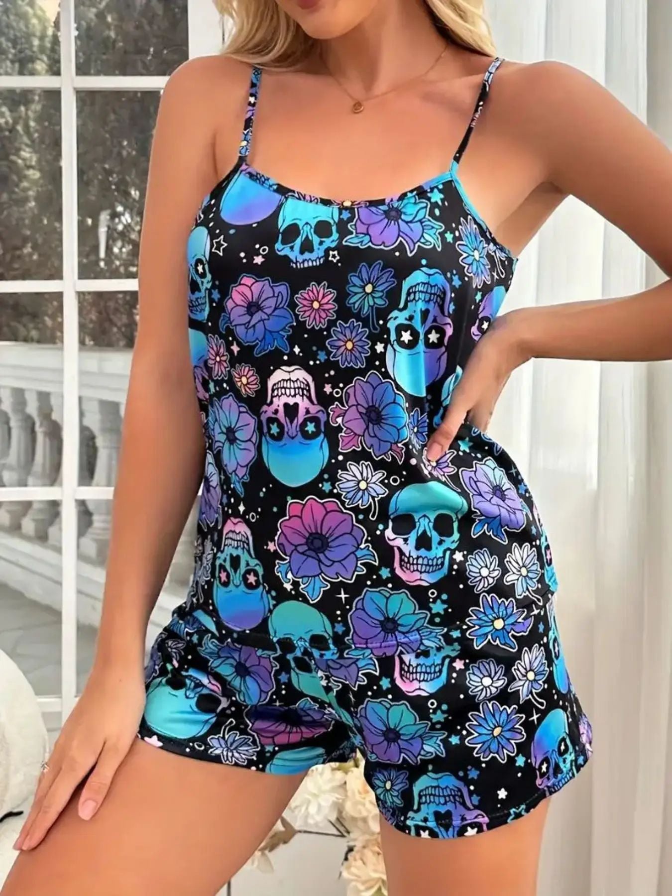Halloween skull bone flower print suspender top shorts home wear pajamas set