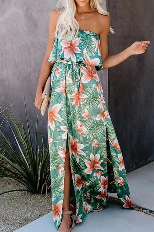Rainforest Print Off-Shoulder Ruffle Split Dress
